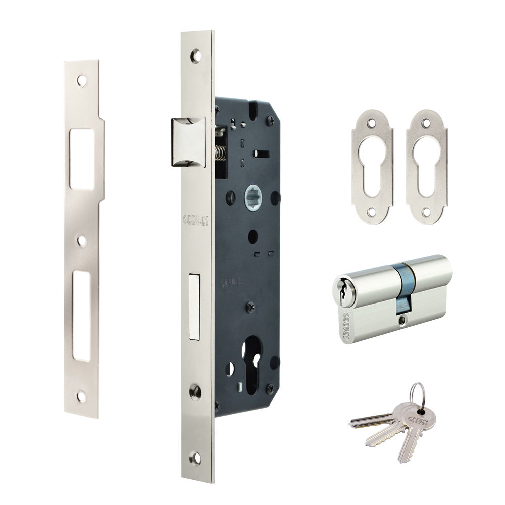 Technical Data: 85 x 40mm Zinc Latch & dead bolt with striker, escutcheon and 70mm brass cylinder with 3nos brass keys satin finish.
